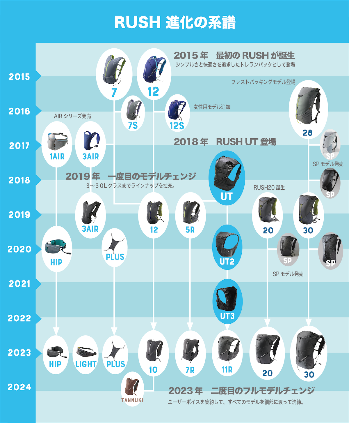 今の日本のトレランシーンは2009年にNHKで放映された『激走!モンブラン』をきっかけに一般への認知が広がり、ランニングブームも追い風となって競技人口が急増。2012年のUTMF初開催により100マイルレースへの関心も広がりました。全国各地でレースやイベントが開催され、競技面の発展だけでなく独自のカルチャーやファッションも芽生えました。そんな2015年に「日本人に必要なトレランパックはなにか?」を追求して生まれたのがRUSHシリーズなのです。なかでも象徴的なモデルを3つご紹介しましょう。