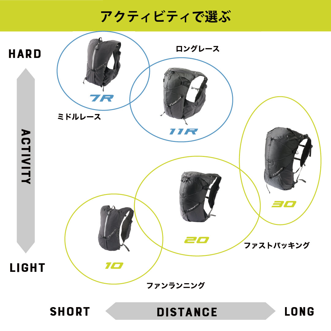 まずは「どんな遊びで使うのか?」をイメージしましょう。RUSHは気軽なトレランから100キロ超のロングレース、ファストパッキングやステージレースまで、幅広いアクティビティに対応した商品ラインナップになっています。