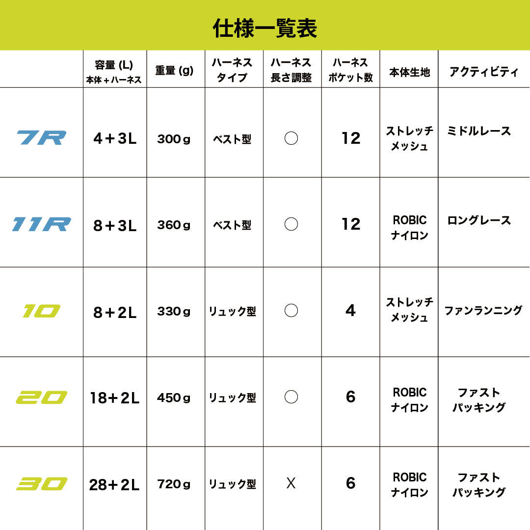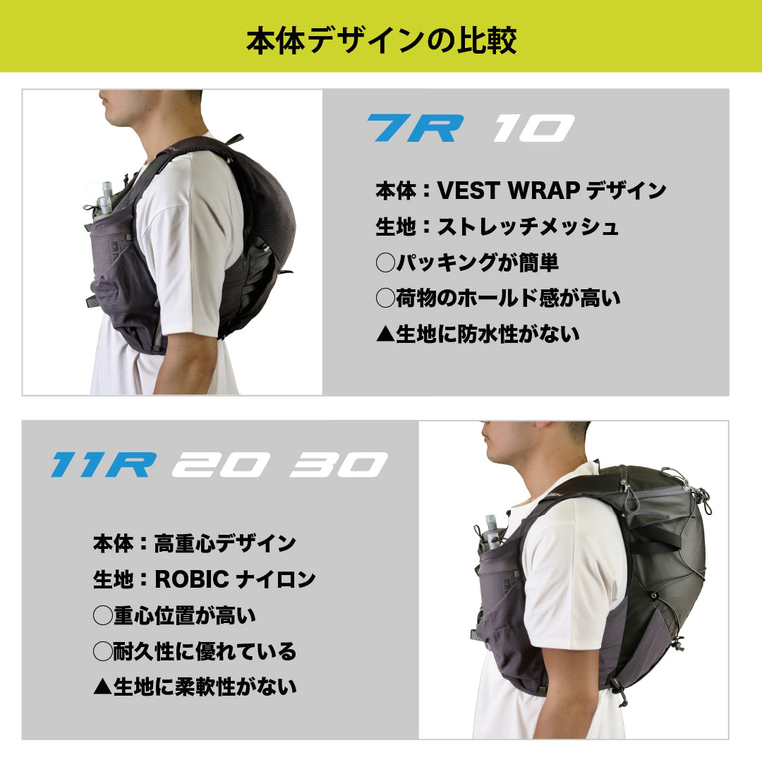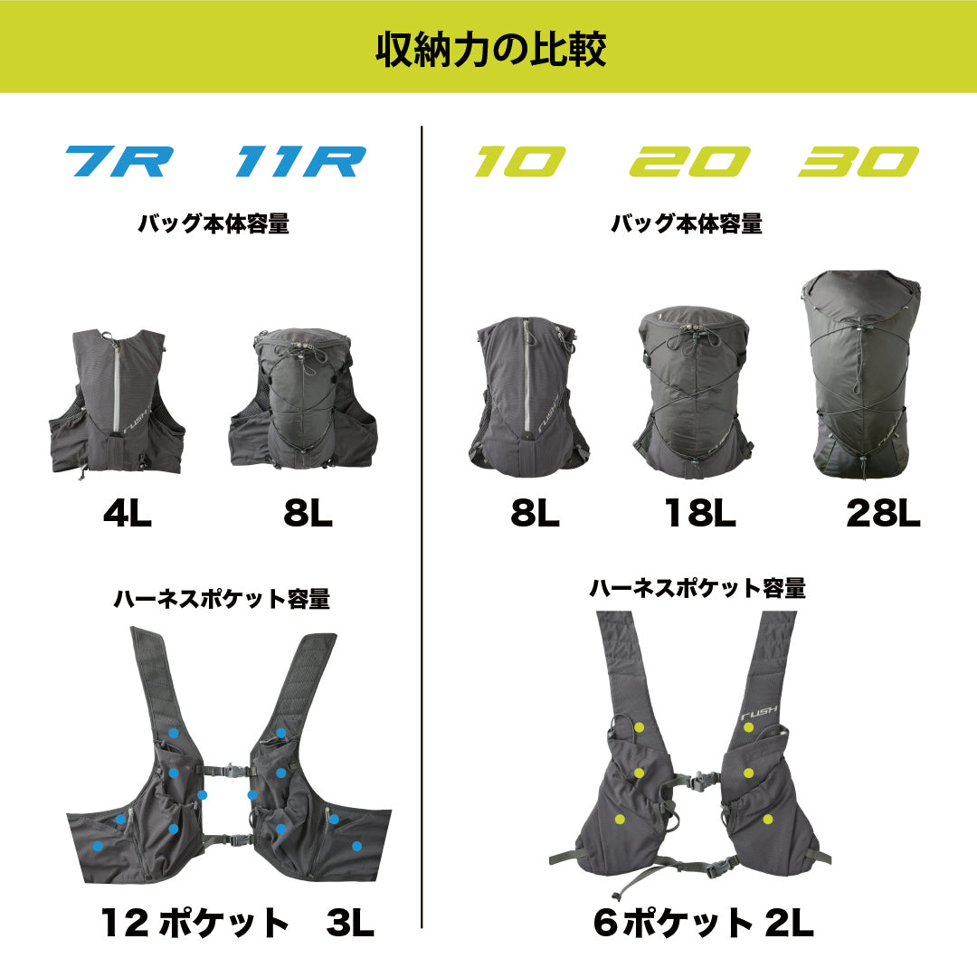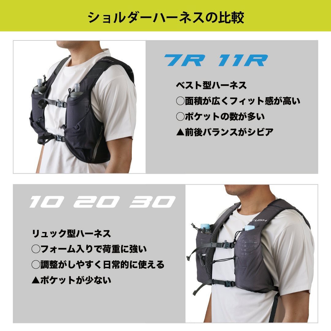 ショルダーハーネスも2タイプあり、レース用(Rのつくモデル)にはベスト型を採用し、その他のモデルにはリュック型ハーネスを採用しています。いずれも無段階で長さ調整ができますので、体型に合わせたフィティングが可能です。(RUSH30は不可)