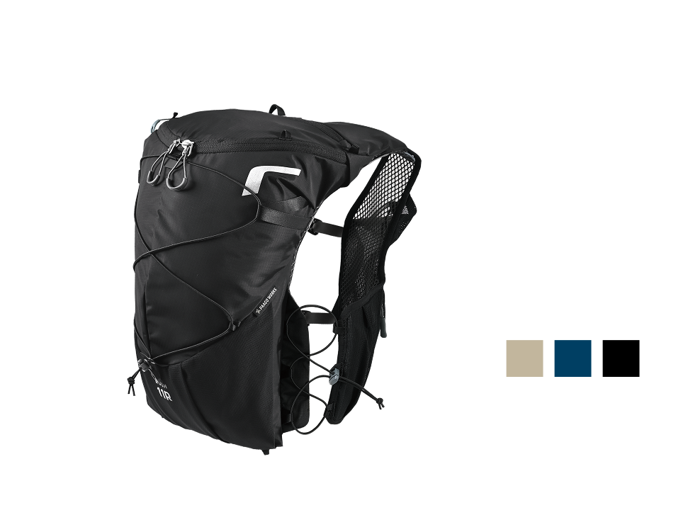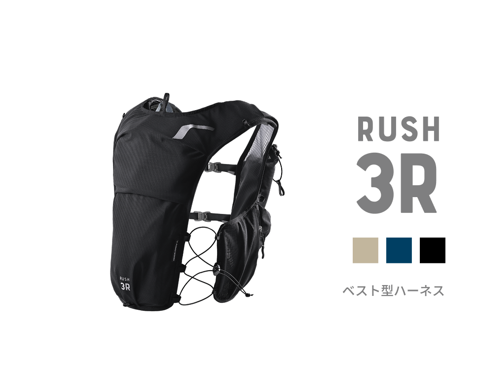 RUSH の特徴であるアジャスタブルハーネスを大幅にアップデート。ショルダー調整に加えて新たにバンジーコード方式のサイドアジャスターを追加。吸い付くようなホールド感を実現しました。同時にフィッティングの幅も拡がり、さまざまな体型のランナーに最適な背負い心地を提供します。