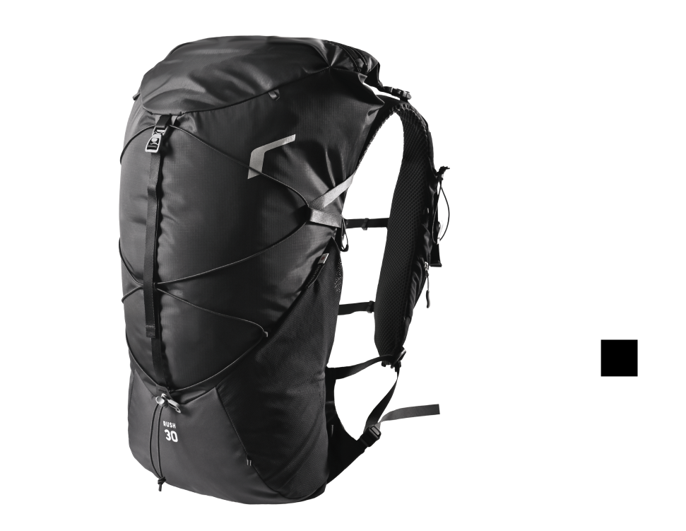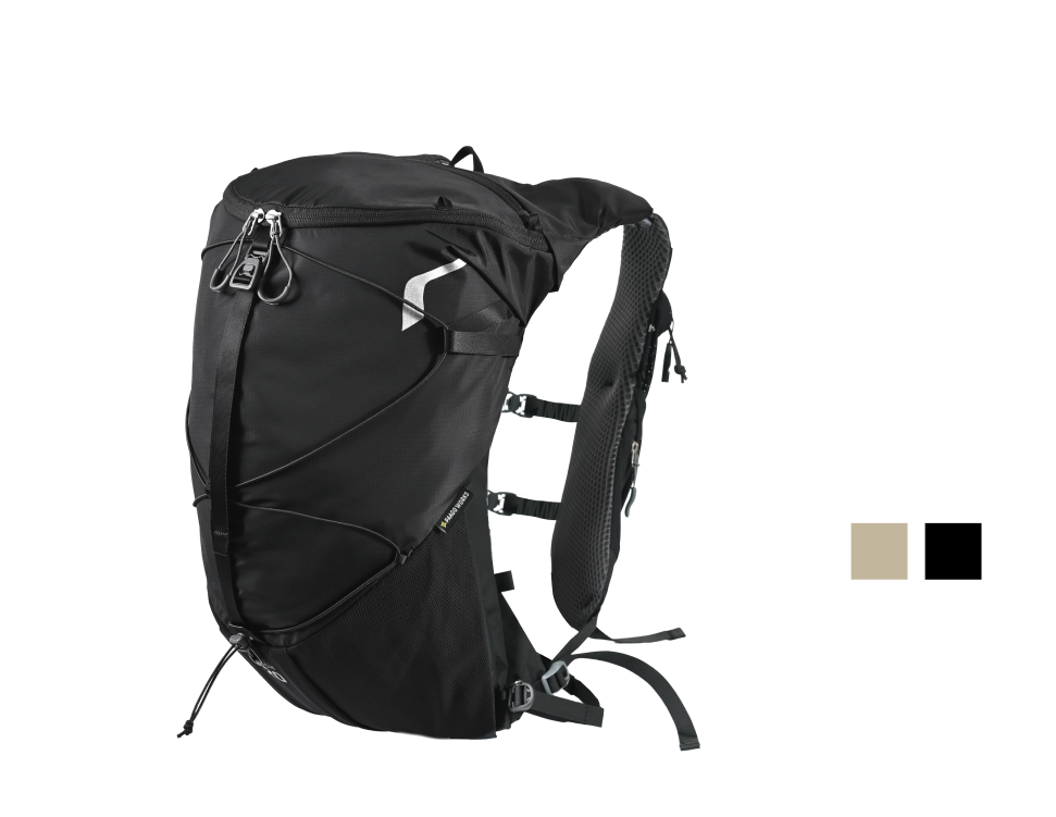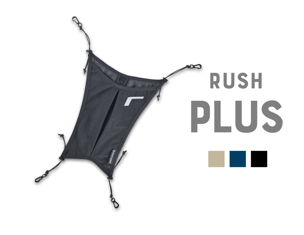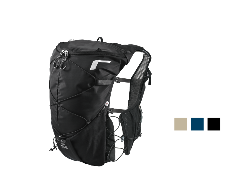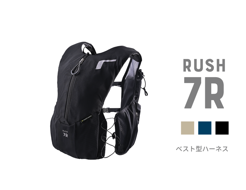 RUSH らしい堅牢さはキープしつつ、軽さと快適さを追求してファブリックをアップデートしました。本体素材には軽量なROBIC100D ナイロンを使用し、背面とハーネスには熱と汗の抜けが良いメッシュを採用。発汗量の多い小型モデルと荷重のかかる大型モデルで素材を使い分けています。