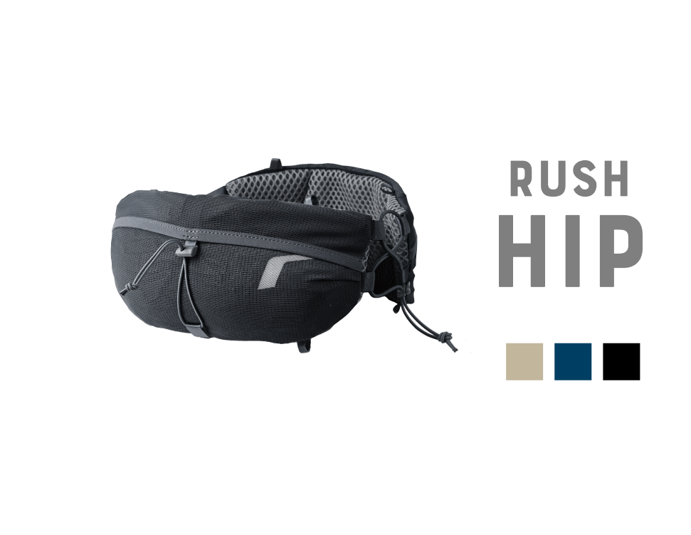 RUSH ならではの使い勝手の良さもアップデート。ランニング中に確実に操作できるよう、アクセスの位置・角度・深さなど細部に至るまで再設計。独自開発のツイスト式バックルや、脱落防止を追求したポケット類など、ランナーの意見を多く取り入れています。