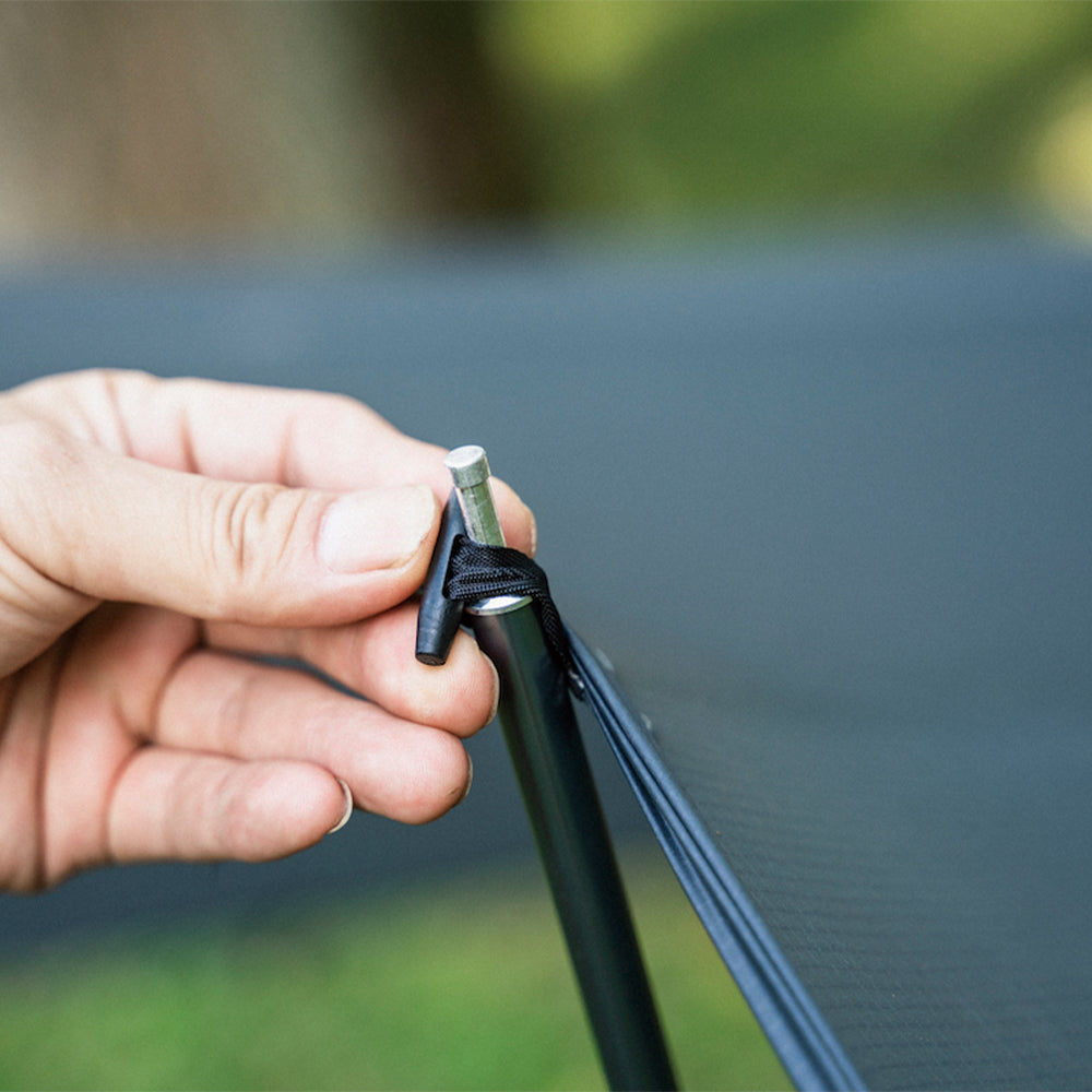 120cm〜140cmの5段階の5cmピッチで長さ調整が可能。先端はタープのハトメやループから外れにくい形状です。サイドにはNINJA STICKの刻印入り。