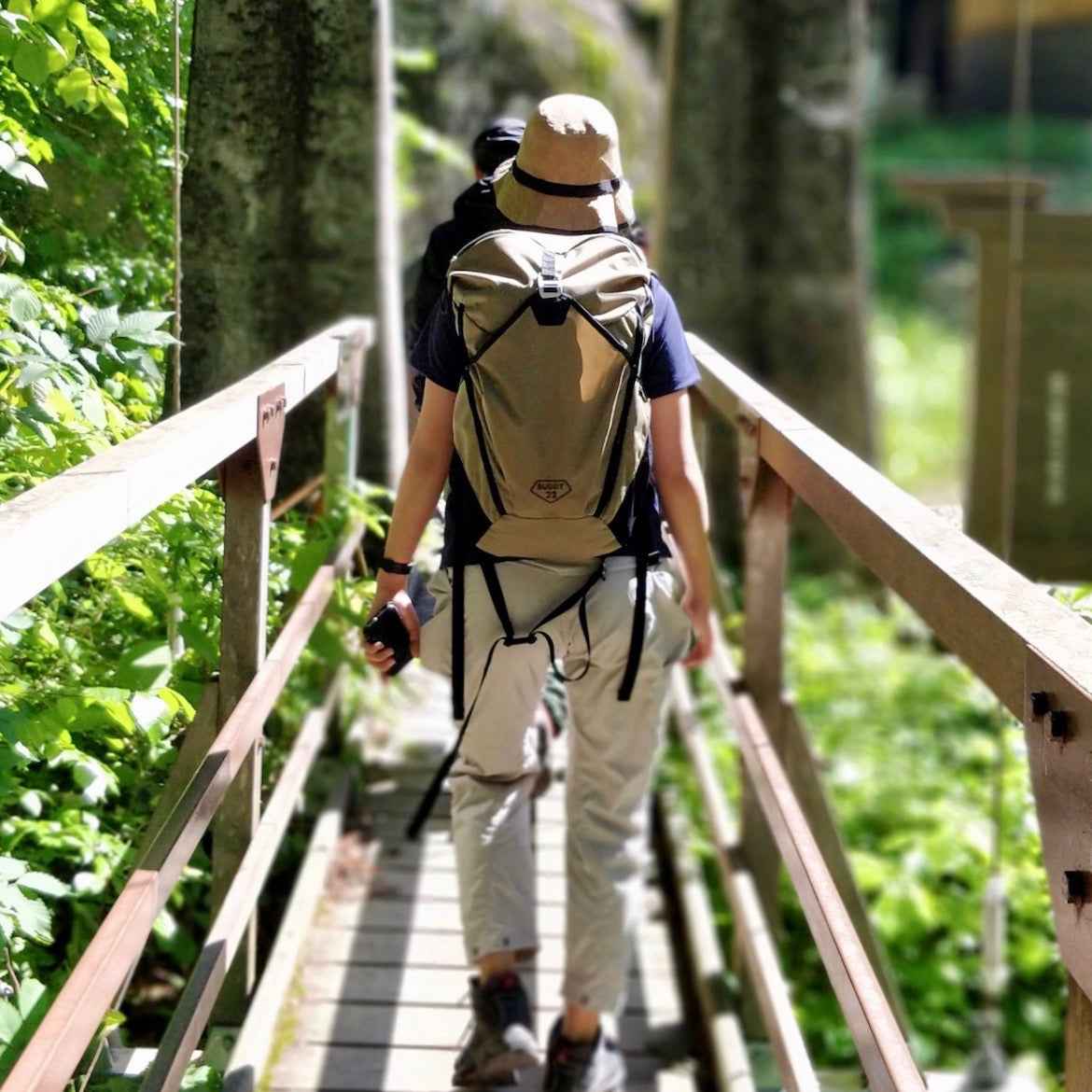 この春に登場したBUDDYはまさにそんなバックパックです。一見オーセンティックなデザインで、道具としての汎用性も高い。だけどよく見れば基本構造からディテールに至るまでとてもユニーク。開発段階においてはシンプルな一本締めから始まりロールトップやバックサイドオープンまで、いくつかの試作&テストからはじめ、最終的にはRUSH28と同じ「高重心設計」を採用しました。開口部が体側に大きく開き、スタビライザーで重心を肩甲骨に寄せるというユニークな構造です。一方で素材は軽量かつタフ、誰もが気負わず使える風合いにこだわりました。さらに各部の収納力とアクセス性はRUSH28より向上させています。まさしく「丸いけど尖っている」バックパックの誕生です。