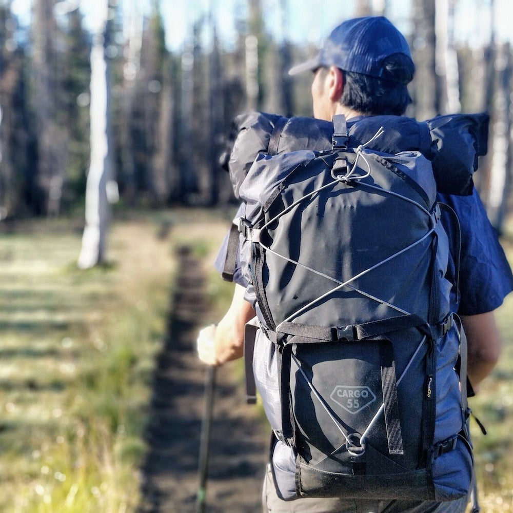 そもそもバックパックの基本要素は「背負う」と「収納する」しかありません。CARGOはこの「収納する」の自由度が特徴です。この特徴をさらに進化させるべく、まずは収納物の検討から始めました。プロトタイプには縦走装備はもちろんのこと、MTBやパックラフト、カメラバッグや三脚を収納してみたり、はたまたゴミ箱や新人スタッフを背負ってみたり...。