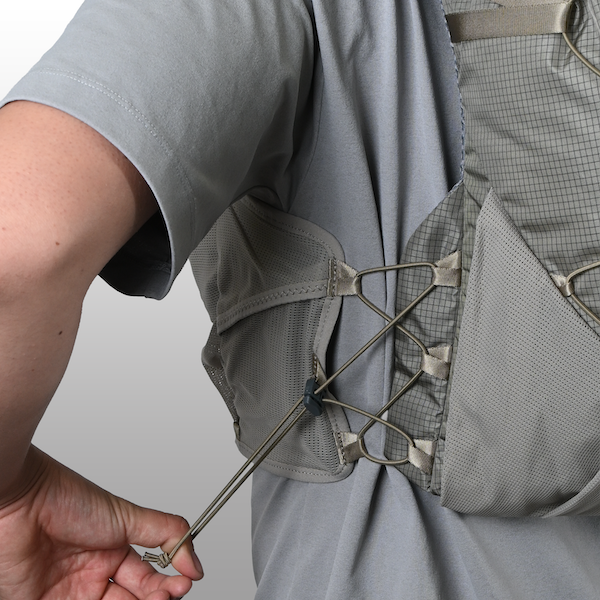 サイドアジャスターには6点式のバンジーコードを採用し、抜群のフィット感と通気性を実現。ウエストにあるドローコードは片手で引くことができるので、ランニング中でも簡単にホールド感を調整できます。
