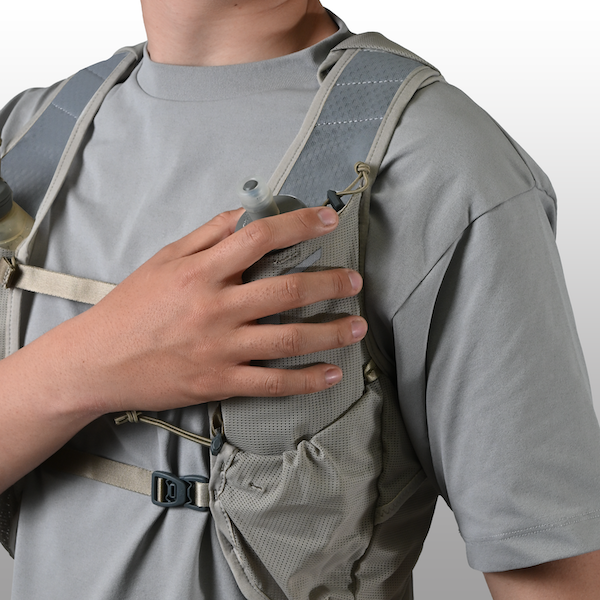 600mlまでのソフトフラスクと500mlのペットボトルに最適化。ドローコードで脱落を防止します。緊急時用のホイッスル付きです。