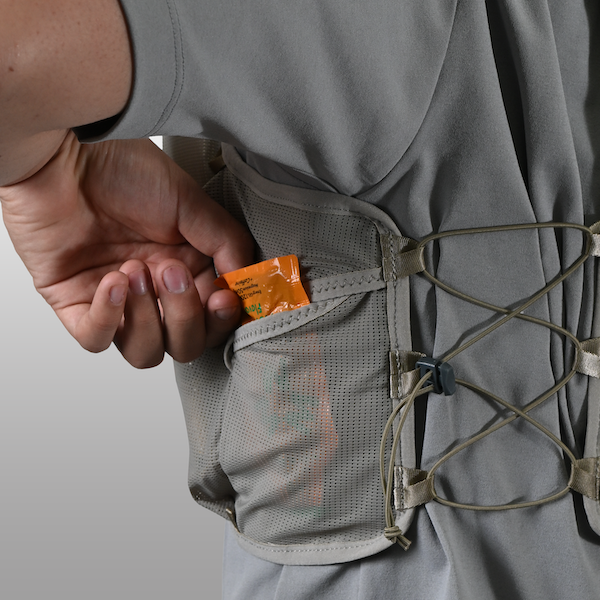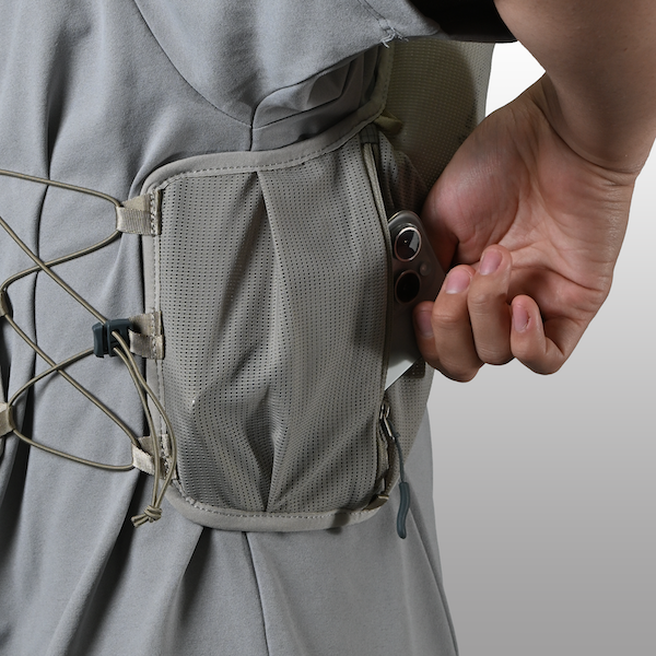 ドローコード付きの下段ポケットは補給食やスマホの収納に適しています。前モデルよりも容量を増やし、アクセス性も向上しました。